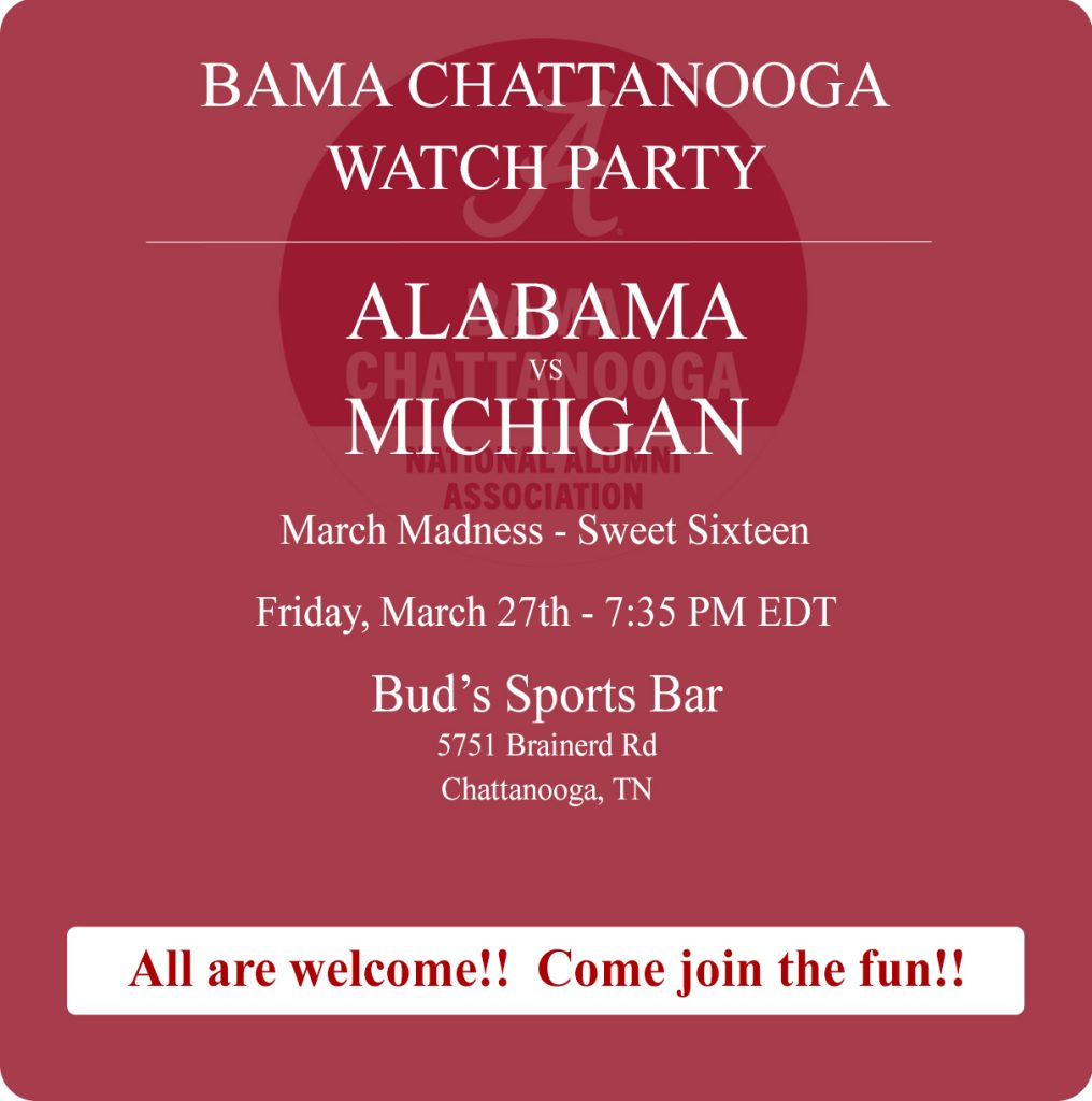 Short notice but we are having a Watch Party for the Sweet Sixteen of March Madness!! The location is different than our football watch parties and may change as we move along in the tournament so keep an eye out here.